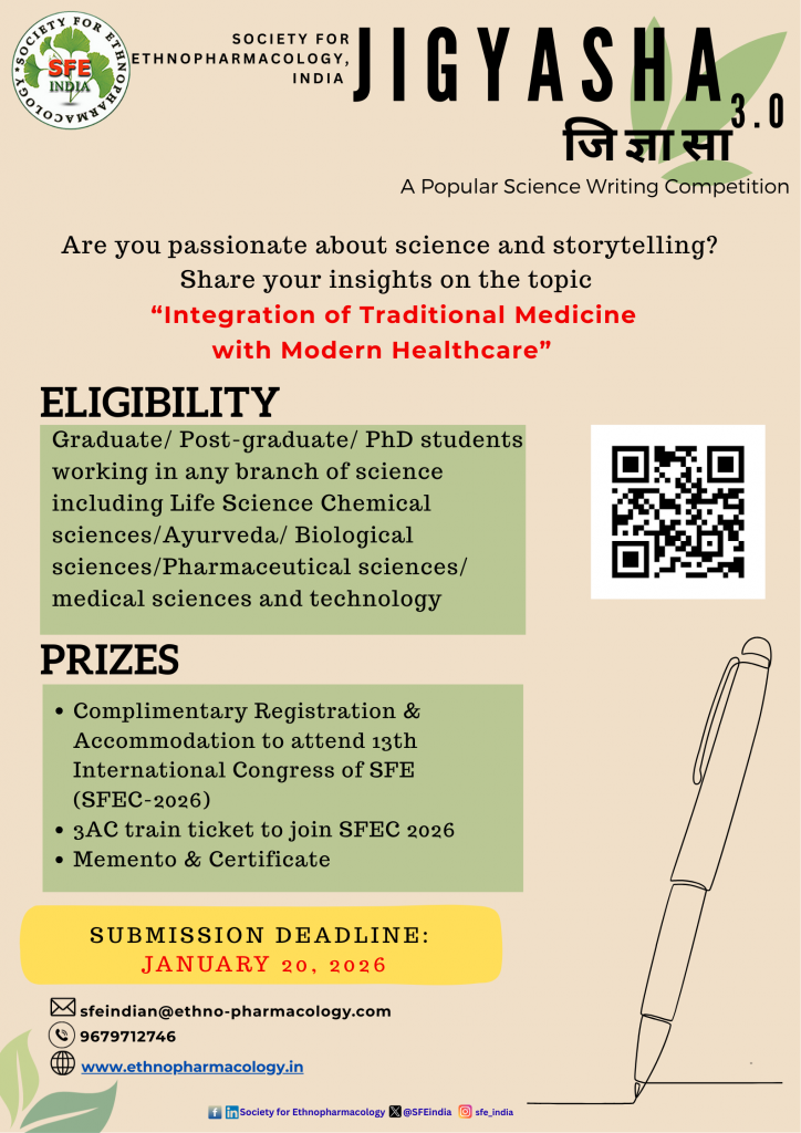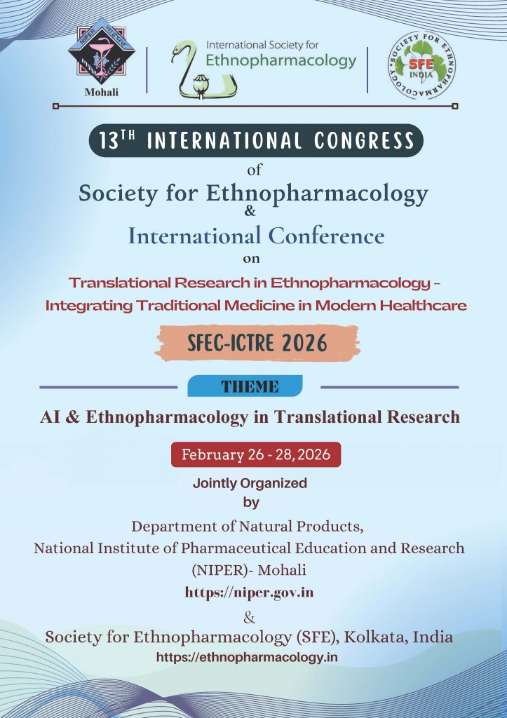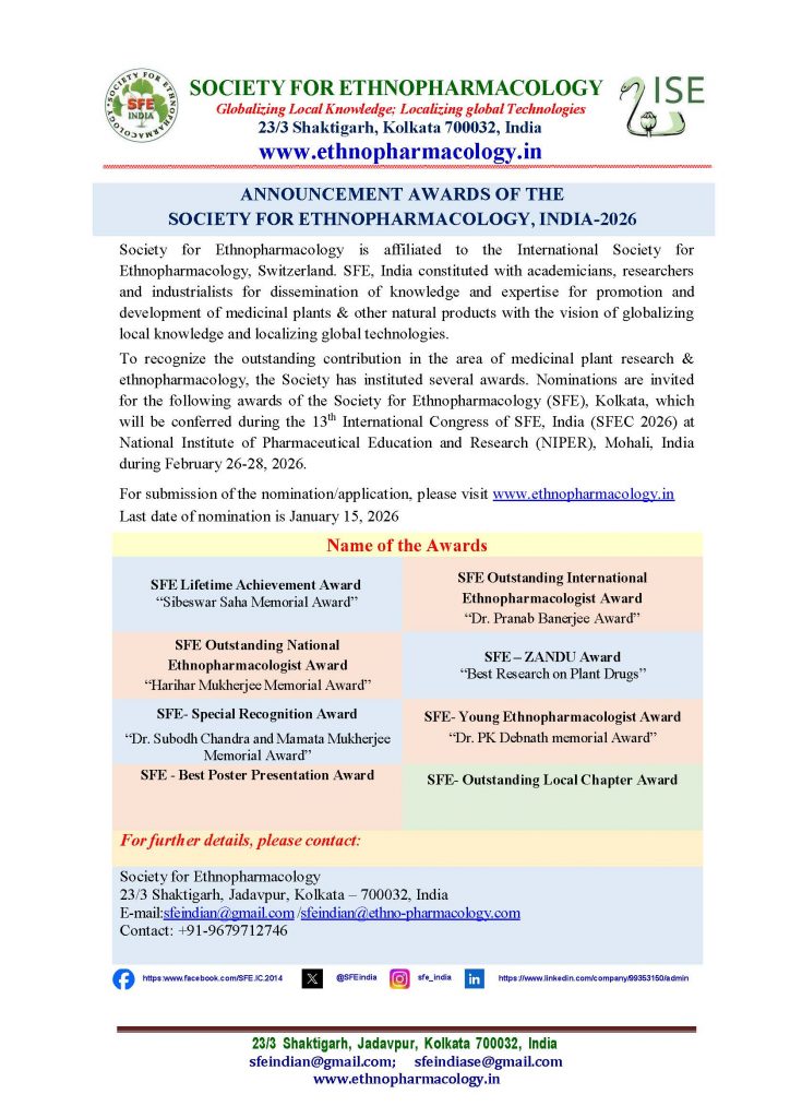 Society for Ethnopharmacology (SFE) is constituted by the eminent academicians, researchers, industrialists with the vision of providing an environment for knowledge sharing among researchers, healthcare practitioners, and decision-makers interested in Ethnopharmacology. The Society is registered under the West Bengal Society Registration act 1961. The main motto of the society is to the dissemination of knowledge on Natural Health Products through the globalization of local knowledge and localizing global technologies. The society will organize conferences, seminars, symposiums, workshops etc in different parts of India for discussion and sharing knowledge on different issues on cultivation, production, quality evaluation, safety, clinical studies, biological screening and several other issues of natural product research. The Society will help to inculcate the modern global knowledge on the herb, herbal remedies, herbal quality assurance, herbal trade and commerce and herbal drug development so that the person with local knowledge can be upgraded. It will form a bridge between the academic and industry to gather scientific and teaching professional in Ethnopharmacology and professional of another area interested in developing cost-effective natural remedies, under one umbrella. The Society will provide various scholarships and awards to the deserving students and scientist jointly with other organizations. SFE will act as a resource at a local level for individuals including students interested in Ethnopharmacology. It will help to encourage career growth and development for its members. The Society will publish newsletters, documents, books etc. for promotion of knowledge in the field of natural product research. The Society will provide various scholarships and awards to the deserving students and scientist jointly with other organizations. For further details please visit www.ethnopharmacology.in or e-mail: sfeindian@gmail.com